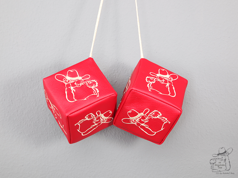 Ein Paar rote Kunstleder-Würfel mit gesticktem Cowboy-Motiv.