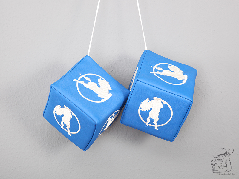 Ein Paar blaue Würfel aus Kunstleder mit weißer Stickerei, hängend vor grauem Hintergrund.
