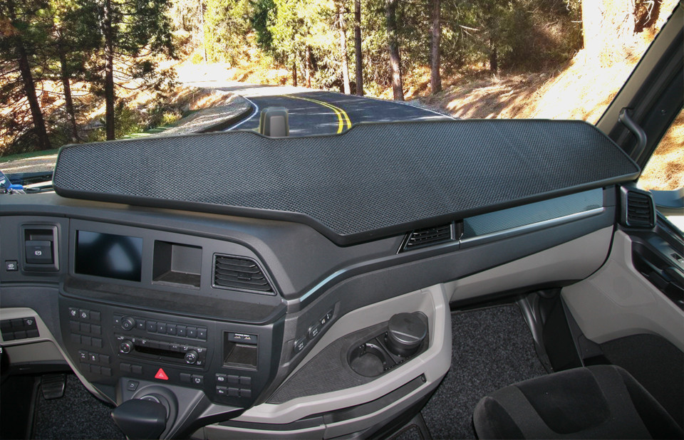 Große, schwarze Ablage mit strukturierter Oberfläche und Ausschnitt auf dem Armaturenbrett eines MAN TGX LKW.