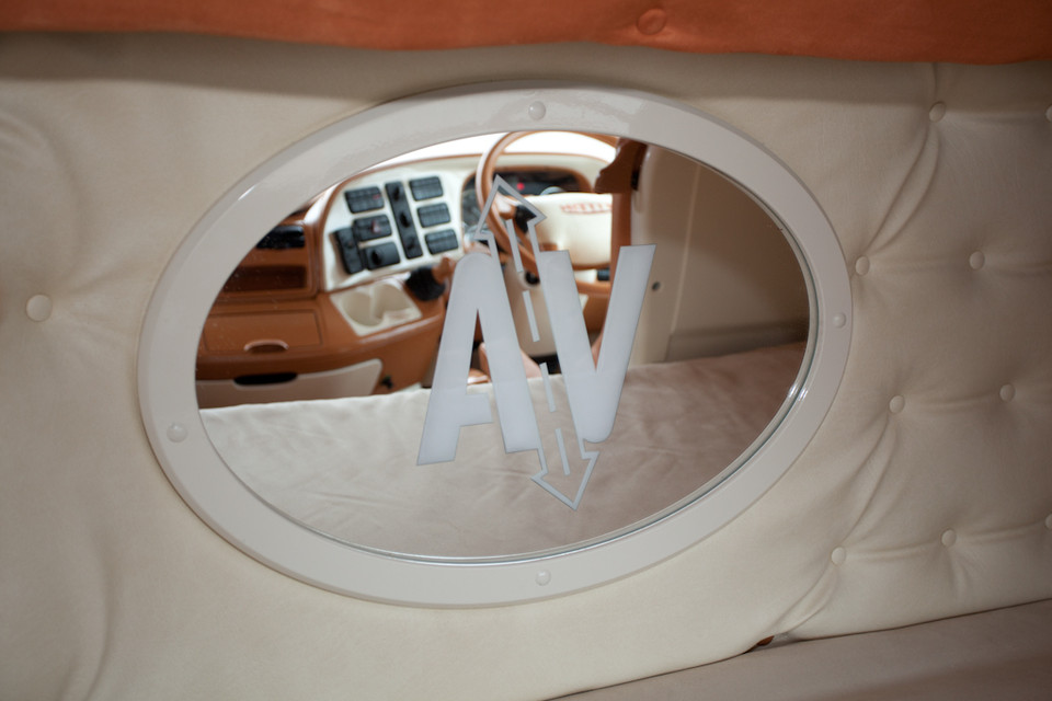 Ovaler LKW-Spiegel mit weißem Rahmen und sandgestrahltem "AV"-Motiv, eingebaut in eine beige LKW-Kabine.