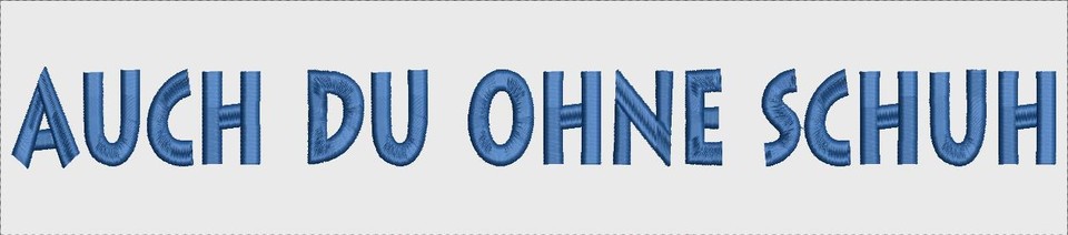 Blauer Stickschriftzug "AUCH DU OHNE SCHUH" als Beispiel für ein Absperrband.
