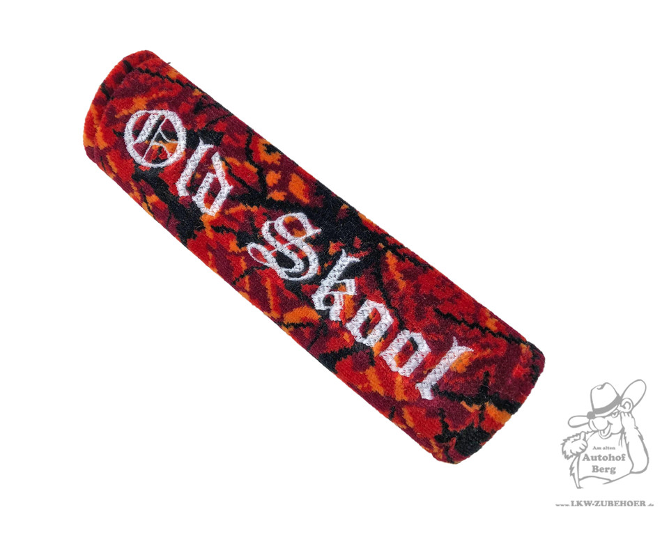 Plüsch Gurtschoner in Rot-Orange-Schwarz mit weißem 'Old Skool' Stick auf einem Autositz.