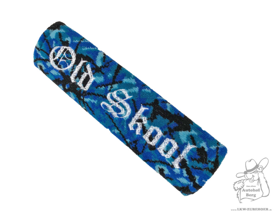 Blauer Plüsch Gurtschoner mit Camouflage-Muster und weißer "Old Skool" Stickerei.