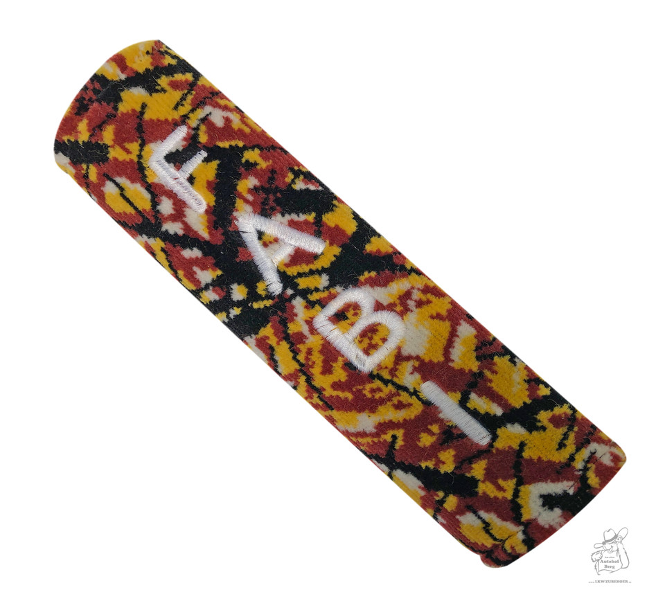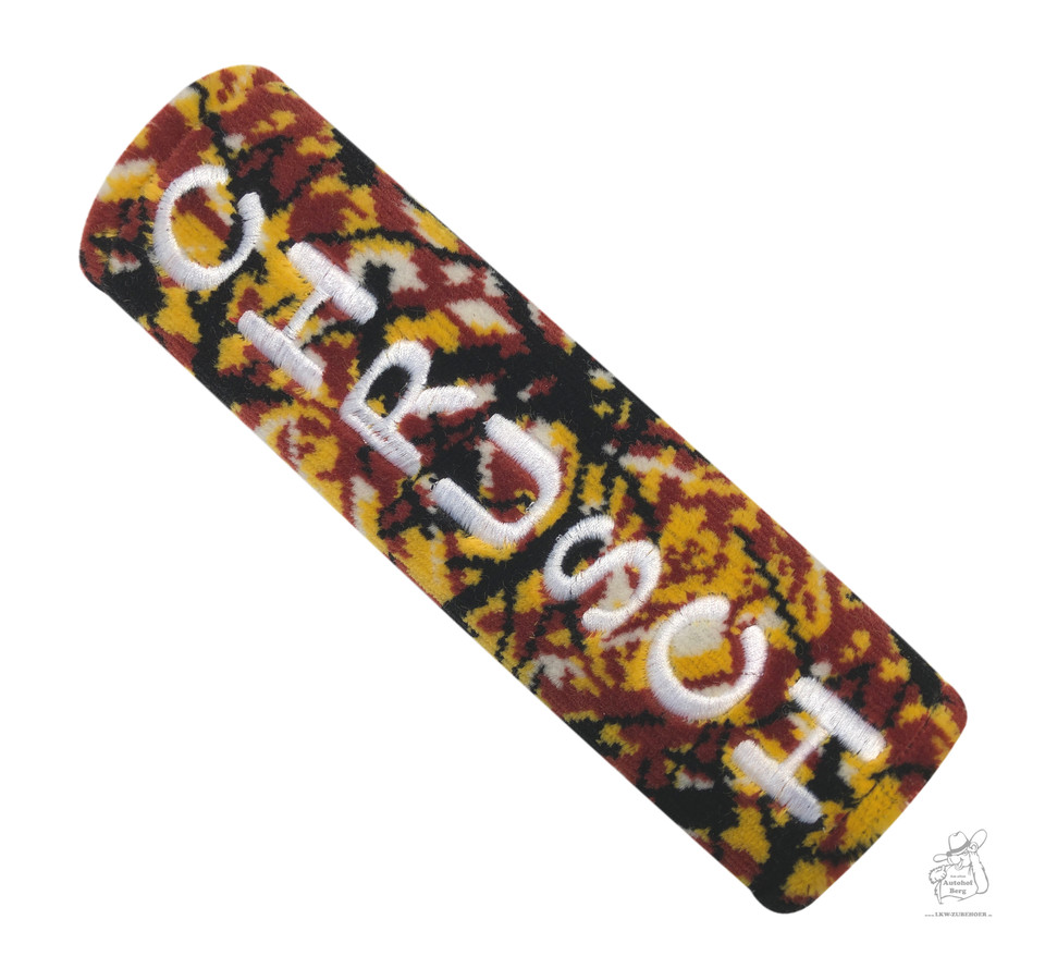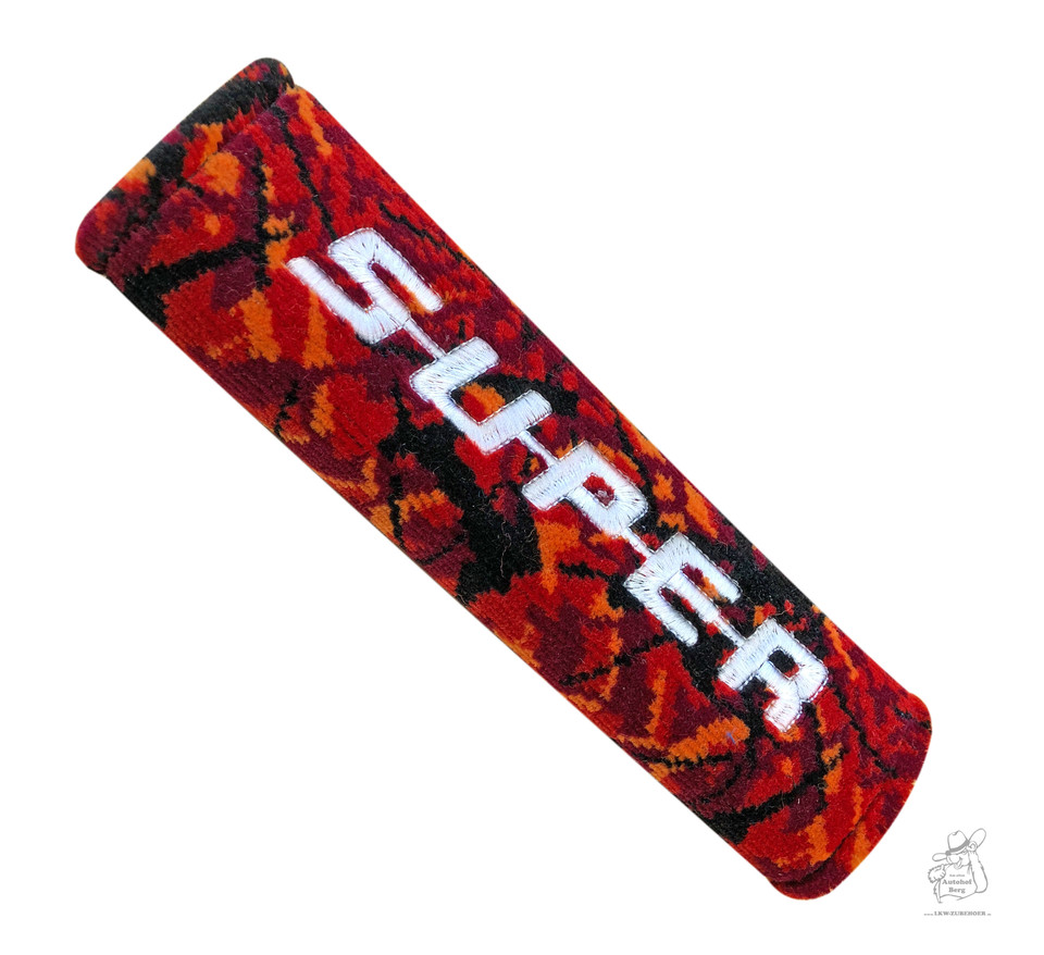 Roter Plüsch Gurtschoner mit orange-schwarzem Muster und weißer Stickerei "Trucker inside".