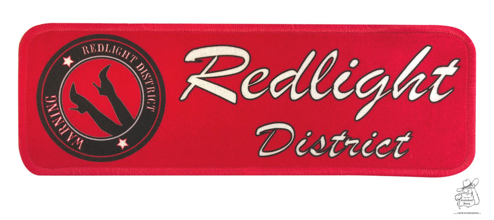 Rote Dashmat mit weißem "Redlight District" Schriftzug und rundem Logo mit Beinen in High Heels.