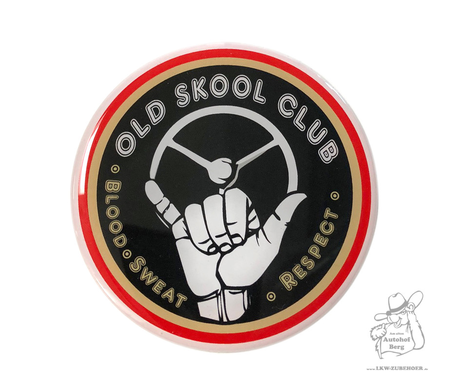 Runder, glänzender 3D Nabensticker 'Old Skool Club'. Schwarzes Zentrum mit weißem Lenkrad und Handmotiv, roter Rand.