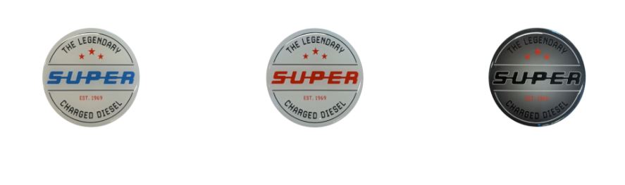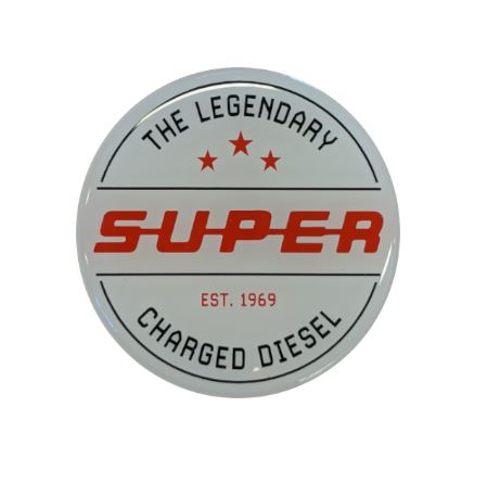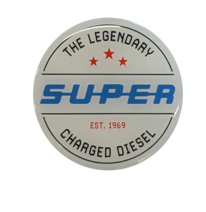Runder, weißer DG Nabensticker mit glänzender Epoxi-Oberfläche. Blauer 'SUPER' Schriftzug, 'The Legendary', 'EST. 1969' und 'Charged Diesel' Text.