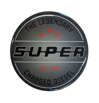 Runder grauer Epoxi Nabensticker mit schwarzem "SUPER" Schriftzug, roten Sternen und "THE LEGENDARY CHARGED DIESEL" Text.