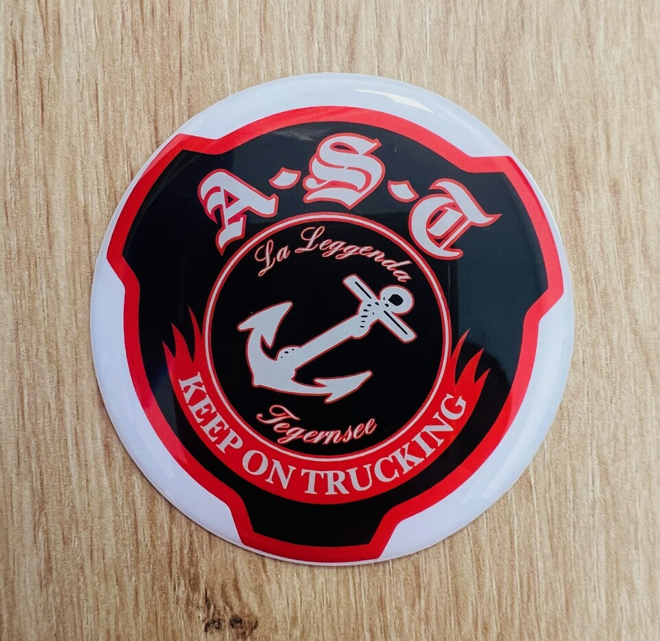Runder, glänzender 3D Nabensticker in Schwarz, Rot und Weiß mit Anker und Schriftzug 'A.S.T' und 'KEEP ON TRUCKING'.
