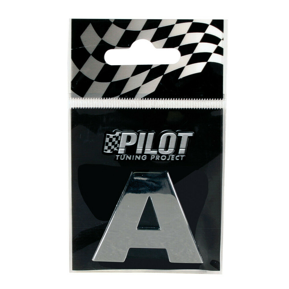 Ein glänzender, chromfarbener 3D Aufkleber 'A' in Verpackung mit Rennflaggenmuster und 'PILOT TUNING PROJECT'.