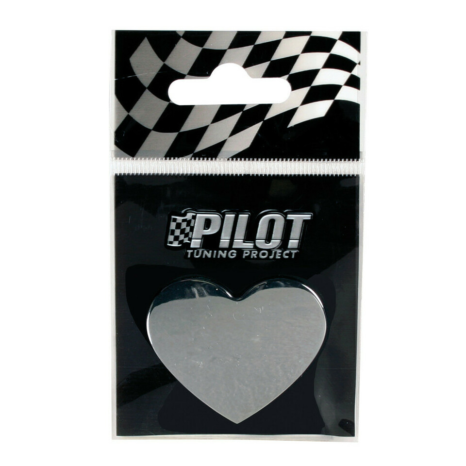 Glänzender, herzförmiger 3D-Aufkleber aus Chrom-Kunststoff in transparenter Verpackung mit Pilot-Logo.