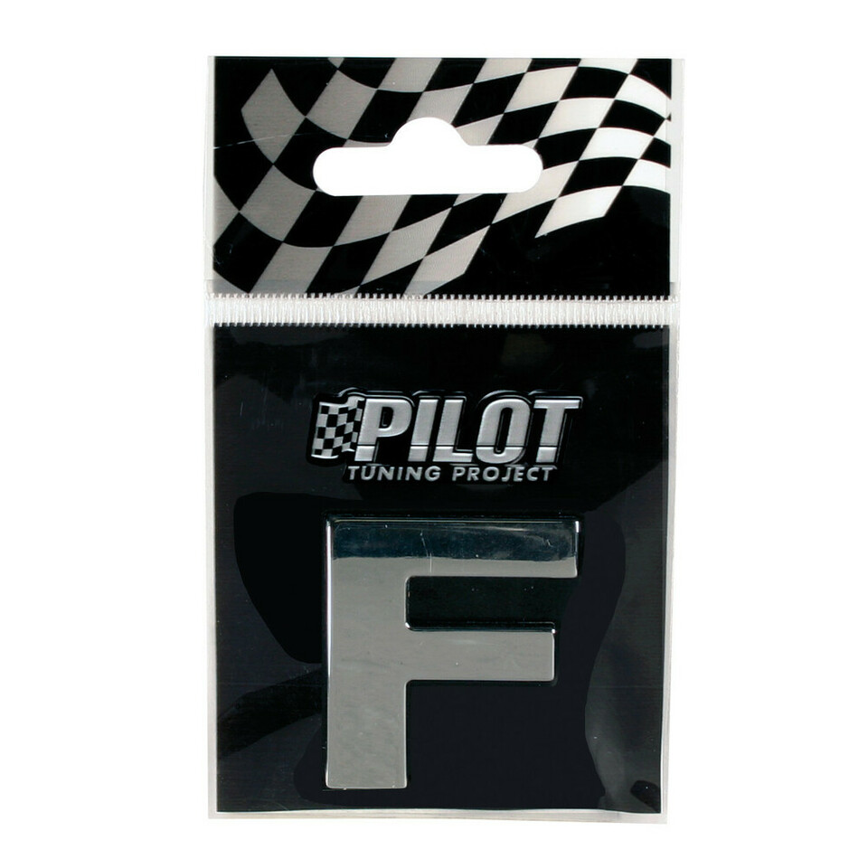 Chromglänzender 3D Aufkleber Buchstabe F von PILOT in transparenter Verpackung.