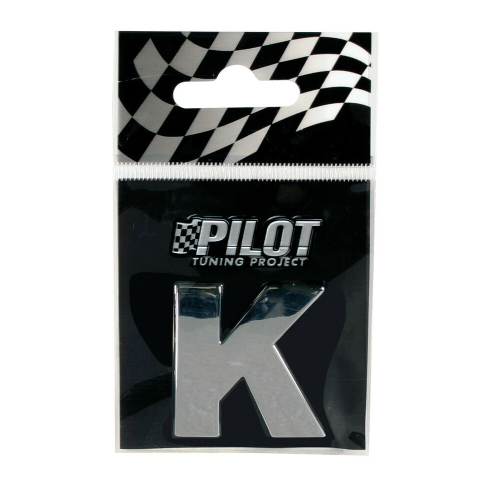 Glänzender 3D Aufkleber Buchstabe K aus verchromtem Kunststoff in transparenter Verpackung mit Pilot-Logo.