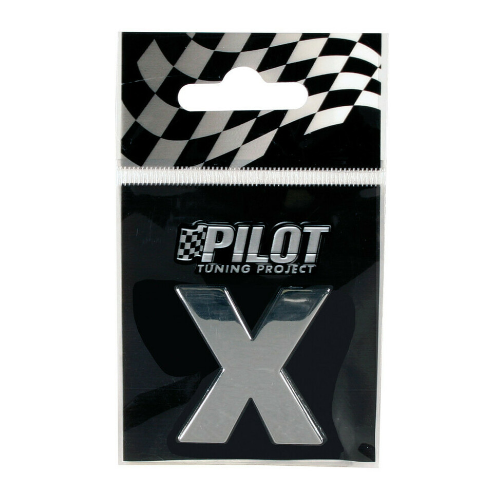Ein 3D-Aufkleber des Buchstabens X aus glänzendem Chrom-Kunststoff in Verpackung mit Pilot Tuning Project Logo.