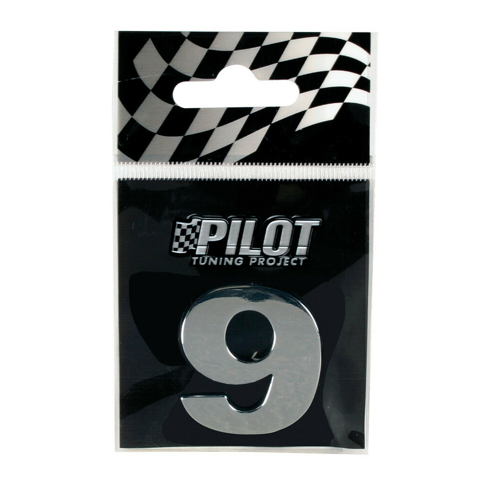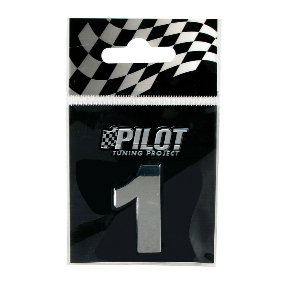 Chromfarbener 3D Aufkleber als Zahl 1 aus geprägtem Kunststoff in der Verpackung. Oben steht 'PILOT TUNING PROJECT'.