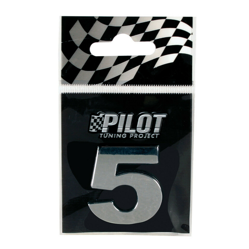 Glänzender 3D Aufkleber in Form der Zahl 5, verchromt, in transparenter Verpackung mit Pilot-Logo.