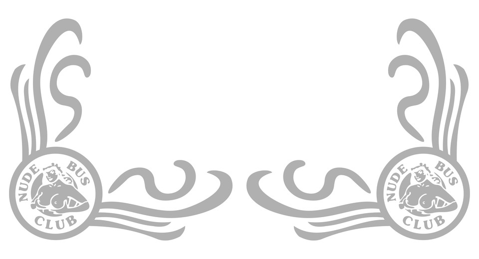 Paar Glas-Dekoraufkleber mit 'Nude Bus Club' Motiv und wellenförmigen Verzierungen. Im Bild grau, tatsächlich milchig transparent.