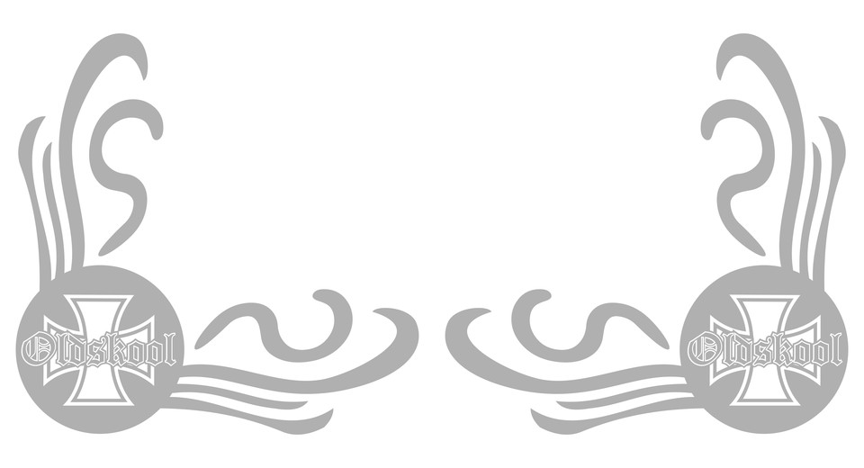 Paar graue Glas-Dekoraufkleber mit 'Old Skool Club' Emblem, Hand am Lenkrad, 'Blood Sweat Respect' und geschwungenen Linien.