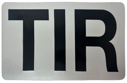 Silbernes Aluminiumschild mit 3D-geprägtem TIR-Schriftzug.
