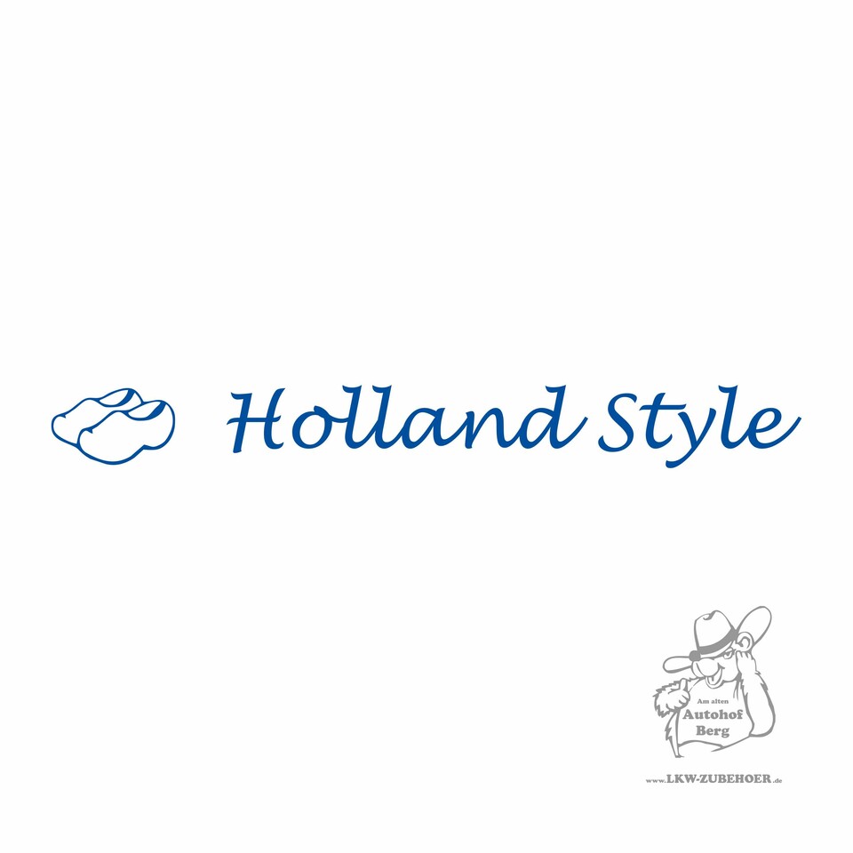 Blauer Aufkleber mit stilisierten Klompen und dem Schriftzug "Holland Style" auf weißem Grund.
