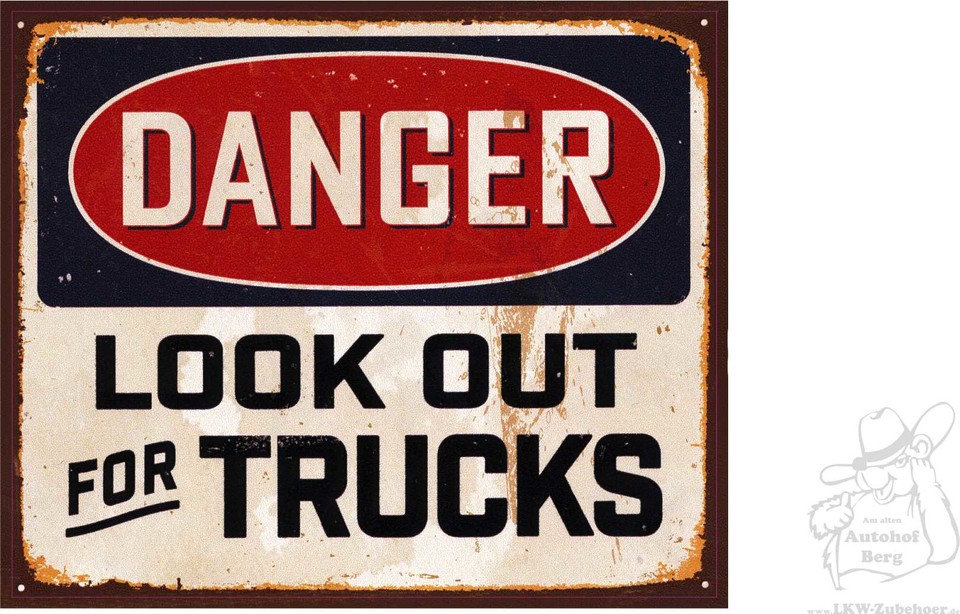 Aufkleber mit rotem DANGER-Schild und dem Text 'LOOK OUT FOR TRUCKS' auf verwittertem Hintergrund.