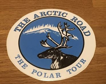 Runder Aufkleber mit Rentier und Bergmotiv in Blau, Weiß, Schwarz. Schriftzug: "The Arctic Road The Polar Tour".