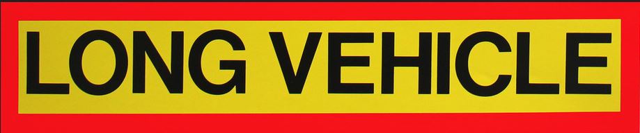 Gelber Aufkleber mit schwarzem Text "LONG VEHICLE" und rotem Rand.