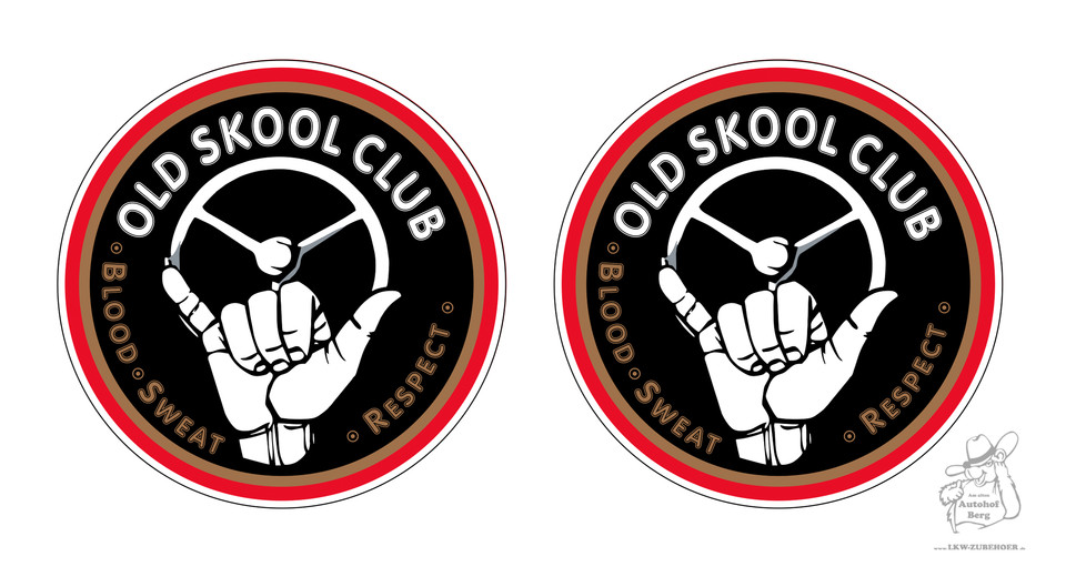 Rundes Aufkleber-Set, schwarz-rot, mit weißer Hand am Lenkrad und Text 'OLD SKOOL CLUB BLOOD SWEAT RESPECT'.