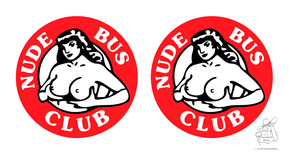 Ein Set aus zwei runden, roten Aufklebern. Sie zeigen eine schwarz-weiße Illustration einer topless Frau und den Schriftzug 'NUDE BUS CLUB'.