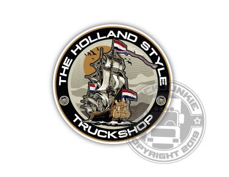 Runder, farbiger Aufkleber mit Segelschiff, niederländischen Flaggen und dem Text 'THE HOLLAND STYLE TRUCKSHOP'.