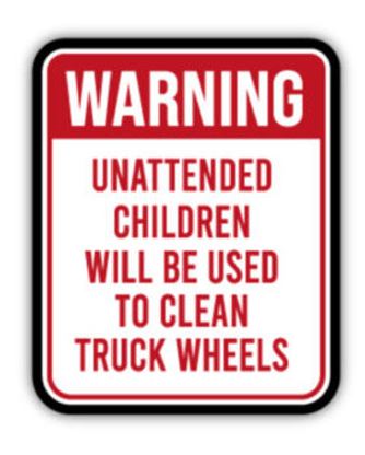 TJ Aufkleber Warning Children. Roter und weißer Aufkleber mit Text: WARNING UNATTENDED CHILDREN WILL BE USED TO CLEAN TRUCK WHEELS.