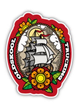 Roter Aufkleber mit Oldskool-Segelschiff-Motiv, umgeben von Blumen und dem Schriftzug "OLDSKOOL TRUCKING".