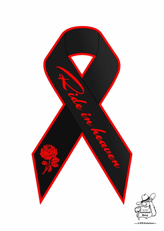 Schwarzer Aufkleber in Form einer Trauerschleife mit rotem Rand, roter Rose und dem Schriftzug "Ride in heaven".