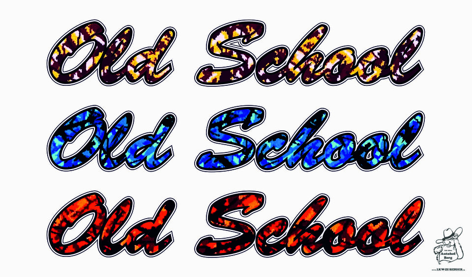 Aufkleber "Old School" im Plüsch-Stil in verschiedenen Farben: Braun, Blau und Rot mit Batikmuster.