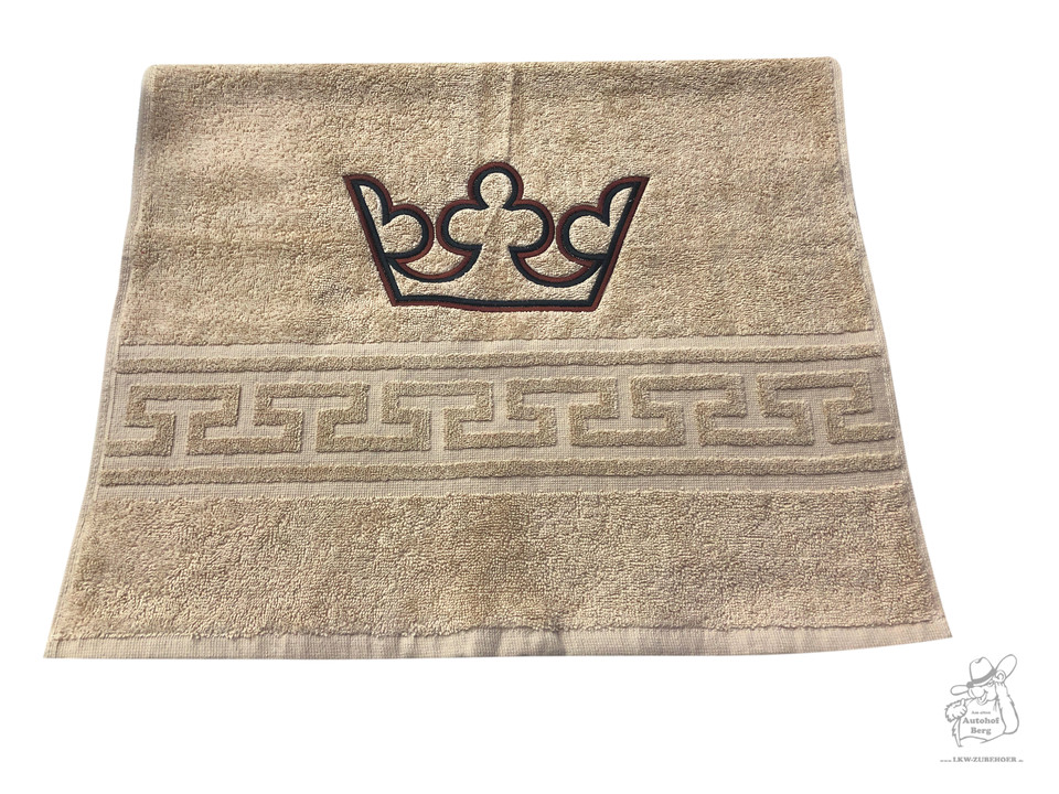 Taubes Duschtuch mit gestickter Krone und Mäander-Muster.