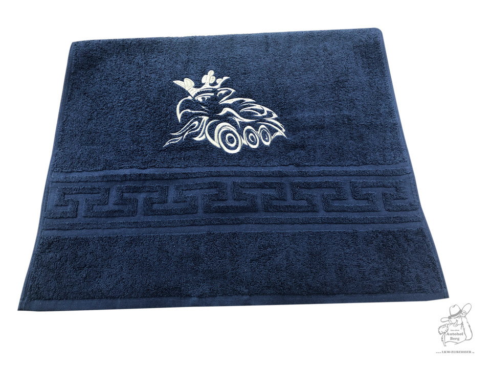 Marineblaues Handtuch mit weißer LKW-Stickerei und einem eingewebten Musterband.