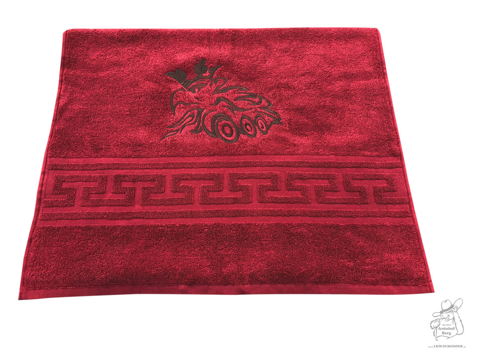 Rotes Handtuch aus Frottee mit gesticktem LKW-Motiv und einem Mäander-Musterband.