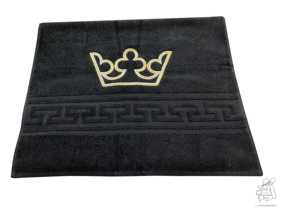 Schwarzes Handtuch mit gold-weiß gestickter Krone und geometrischem Musterband.