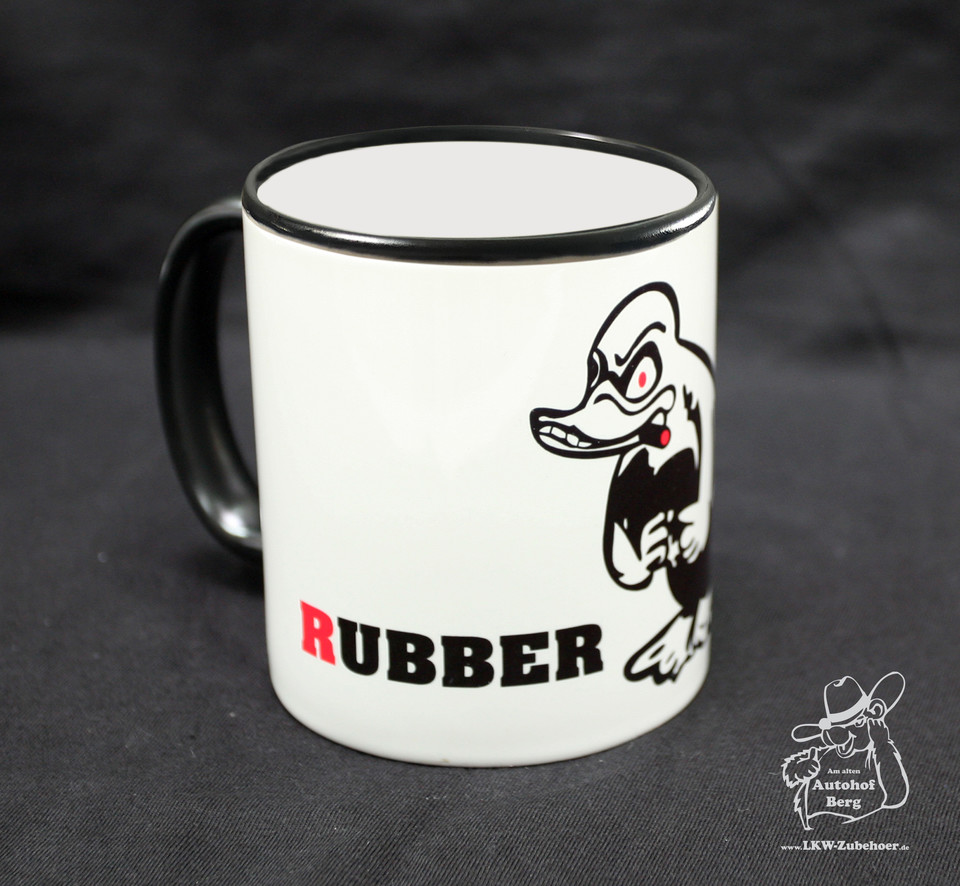 Weiße Tasse mit schwarzem Henkel und Rand, bedruckt mit einer schwarzen Rubberduck-Ente und dem Schriftzug "RUBBER".
