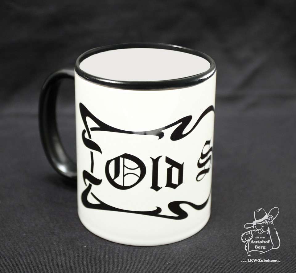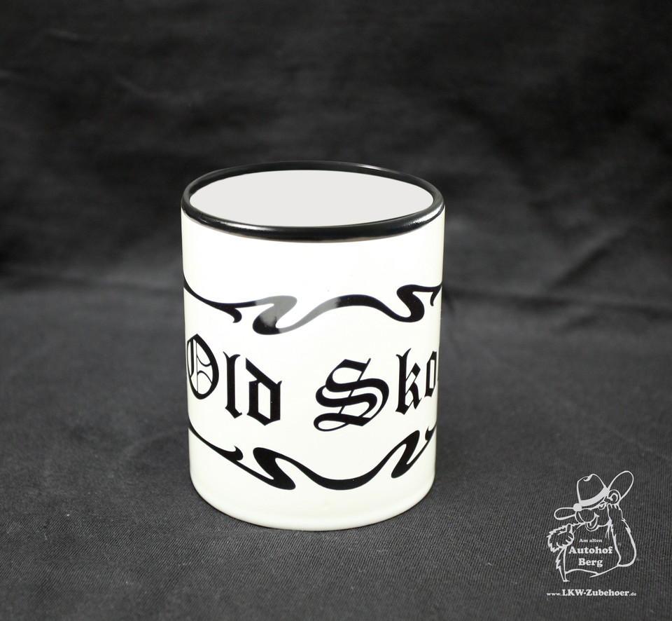 Weiße Tasse mit schwarzem "Old Skool" Schriftzug und schwarzem Rand.