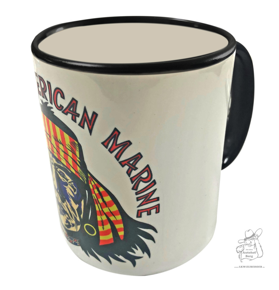 Weiße Tasse mit schwarzem Henkel und schwarzem Rand. Mit "AMERICAN MARINE" Schriftzug und farbigem Motiv.