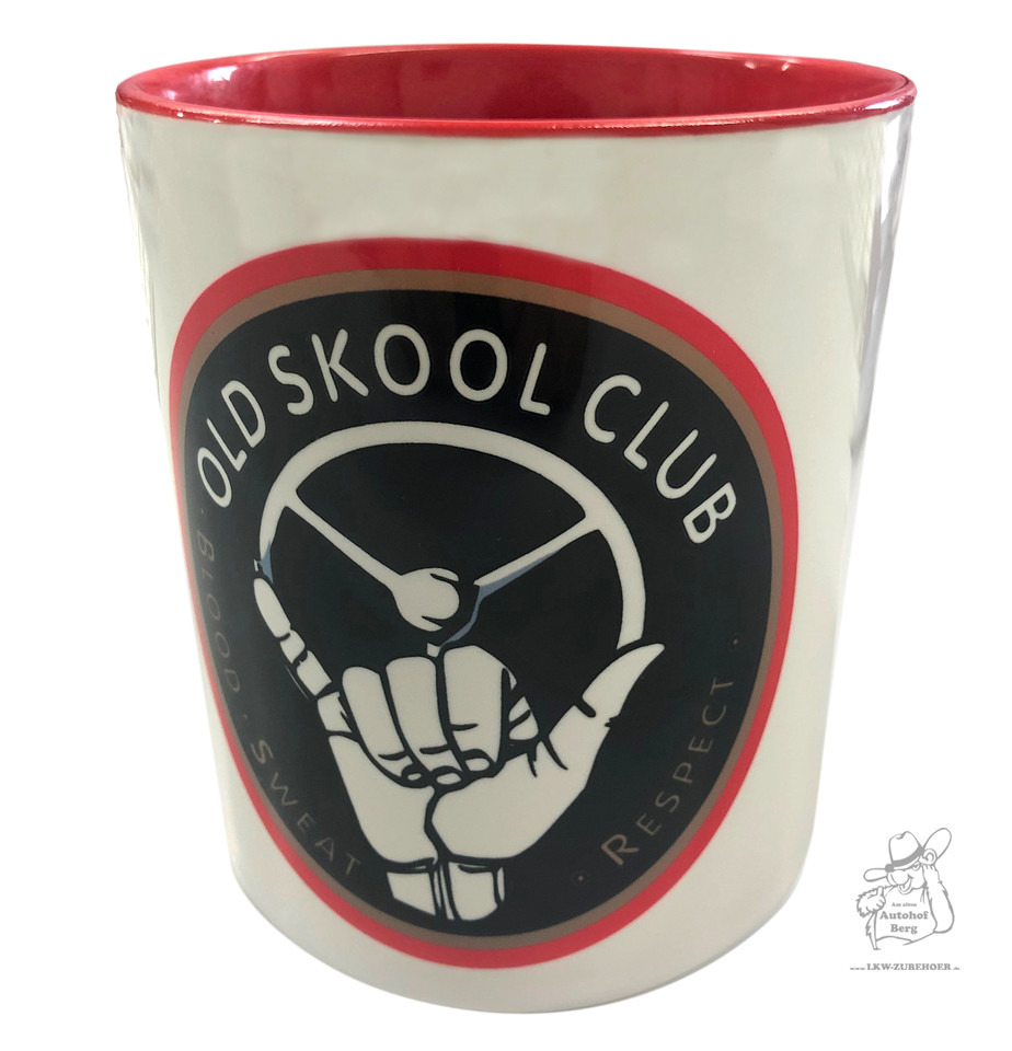 Weiße Tasse mit schwarzem Rand und großem "Old Skool Club" Aufdruck, der ein Lenkrad und eine Hand zeigt.