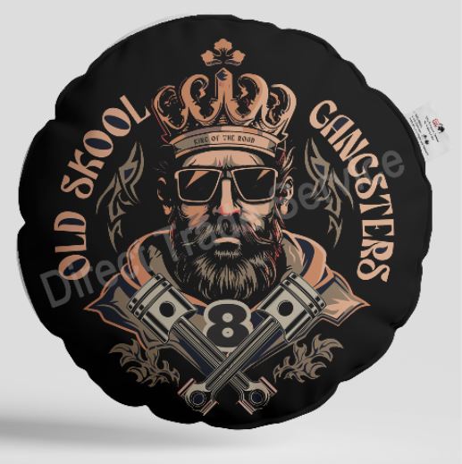 Rundes schwarzes Kissen mit Text "OLD SKOOL GANGSTERS".