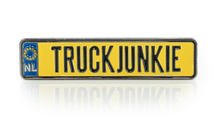 Gelber Pin in Form einer Kennzeichenplatte mit schwarzem "TRUCK JUNKIE" Schriftzug und blauem NL-Feld.