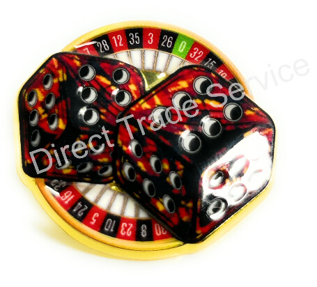 Roter DTS PIN mit Plüschwürfel-Motiv auf Rouletterad.