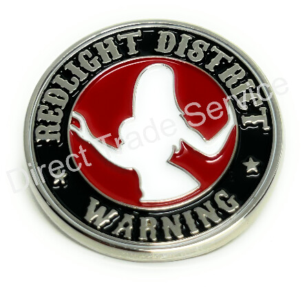 Runder Metallpin, silber, schwarz und rot. Zeigt eine weiße Frauensilhouette und den Text 'REDLIGHT DISTRICT WARNING'.
