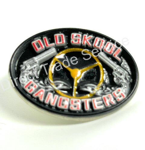 Ovaler DTS PIN mit zwei Revolvern, gelbem Lenkrad und rotem Text 'OLD SKOOL GANGSTERS' auf Schwarz.
