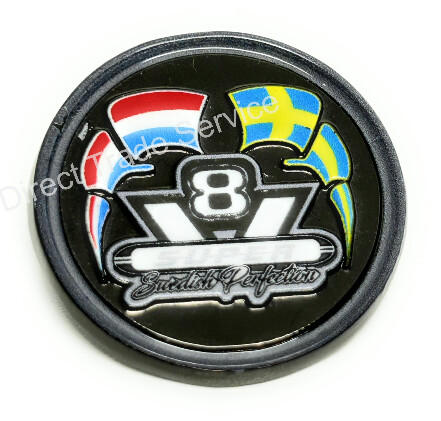 Runder schwarzer DTS PIN mit V8-Symbol, schwedischer und niederländischer Flagge und "Swedish Perfection" Schriftzug.