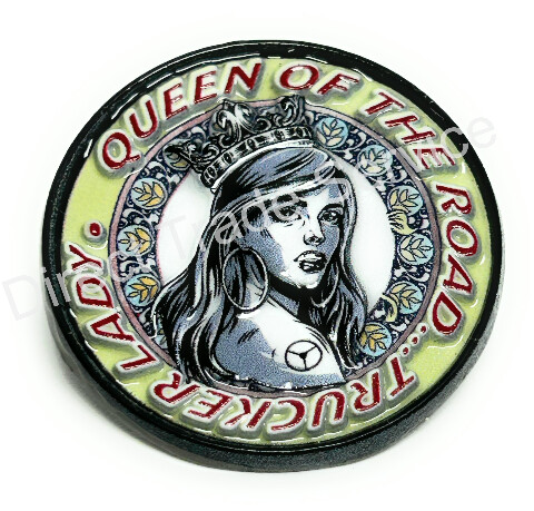 Glänzender, runder DTS PIN Lady Trucker mit farbiger Abbildung einer Frau mit Krone und dem Text 'Queen of the Road Lady Trucker'.