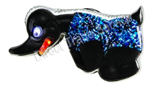 Schwarzer DTS PIN in Entenform mit blauem Plüsch-Muster, weißen Augen und orangefarbenem Schnabel.